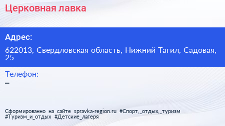 Церковная лавка по адресу 622013, Свердловская область, Нижний Тагил, Садовая, 25 в дальнейшем Организация, размещена в следующих категориях: