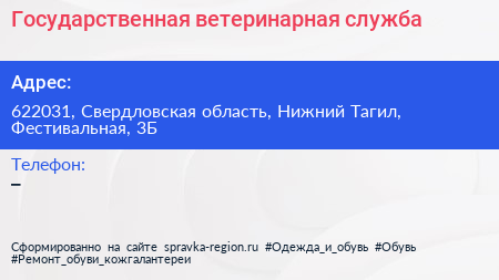 Государственная ветеринарная служба по адресу 622031, Свердловская область, Нижний Тагил, Фестивальная, 3Б в дальнейшем Организация, размещена в следующих категориях: