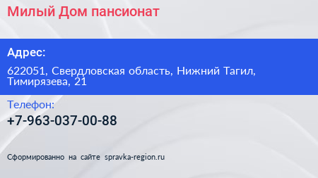 Милый Дом, пансионат по адресу 622051, Свердловская область, Нижний Тагил, Тимирязева, 21 в дальнейшем Организация, размещена в следующих категориях: