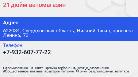21 дюйм, автомагазин по адресу 622034, Свердловская область, Нижний Тагил, проспект Ленина, 73 в дальнейшем Организация, размещена в следующих категориях:
