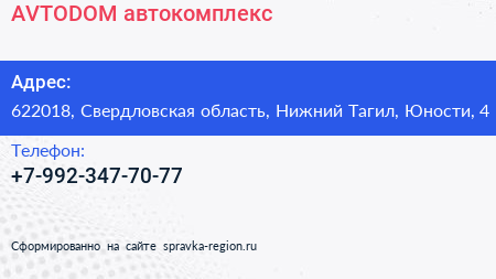 AVTODOM, автокомплекс по адресу 622018, Свердловская область, Нижний Тагил, Юности, 4 в дальнейшем Организация, размещена в следующих категориях: