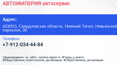 АВТОИМПЕРИЯ, автосервис по адресу 622013, Свердловская область, Нижний Тагил, Невьянский переулок, 30 в дальнейшем Организация, размещена в следующих категориях:
