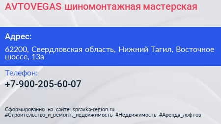 AVTOVEGAS, шиномонтажная мастерская по адресу 62200, Свердловская область, Нижний Тагил, Восточное шоссе, 13а в дальнейшем Организация, размещена в следующих категориях: