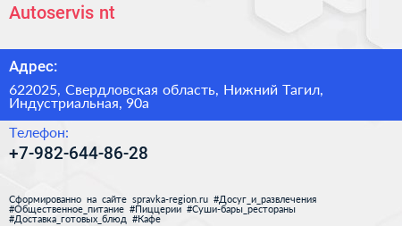Autoservis nt по адресу 622025, Свердловская область, Нижний Тагил, Индустриальная, 90а в дальнейшем Организация, размещена в следующих категориях: