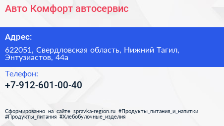 Авто-Комфорт, автосервис по адресу 622051, Свердловская область, Нижний Тагил, Энтузиастов, 44а в дальнейшем Организация, размещена в следующих категориях: