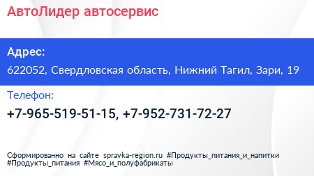 АвтоЛидер, автосервис по адресу 622052, Свердловская область, Нижний Тагил, Зари, 19 в дальнейшем Организация, размещена в следующих категориях: