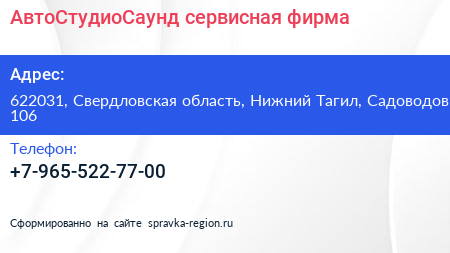 АвтоСтудиоСаунд, сервисная фирма по адресу 622031, Свердловская область, Нижний Тагил, Садоводов, 106 в дальнейшем Организация, размещена в следующих категориях: