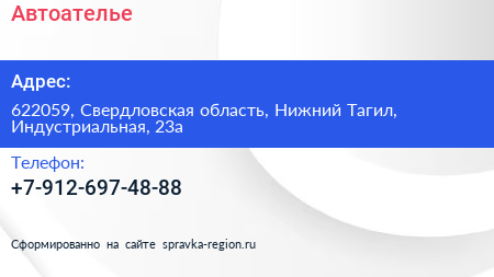 Автоателье по адресу 622059, Свердловская область, Нижний Тагил, Индустриальная, 23а в дальнейшем Организация, размещена в следующих категориях: