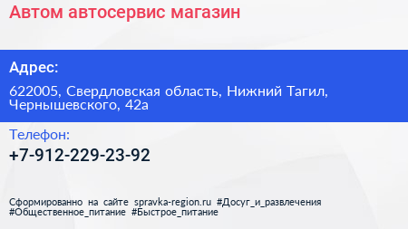 Автом, автосервис-магазин по адресу 622005, Свердловская область, Нижний Тагил, Чернышевского, 42а в дальнейшем Организация, размещена в следующих категориях: