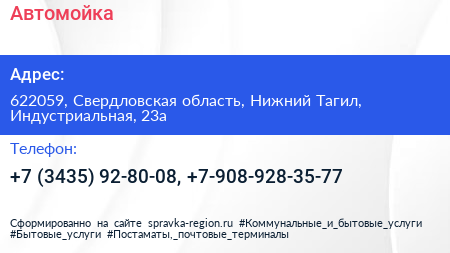 Автомойка по адресу 622059, Свердловская область, Нижний Тагил, Индустриальная, 23а в дальнейшем Организация, размещена в следующих категориях: