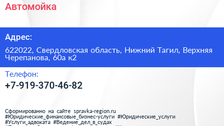 Автомойка по адресу 622022, Свердловская область, Нижний Тагил, Верхняя Черепанова, 60а к2 в дальнейшем Организация, размещена в следующих категориях: