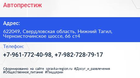 Автопрестиж по адресу 622049, Свердловская область, Нижний Тагил, Черноисточинское шоссе, 66 ст4 в дальнейшем Организация, размещена в следующих категориях: