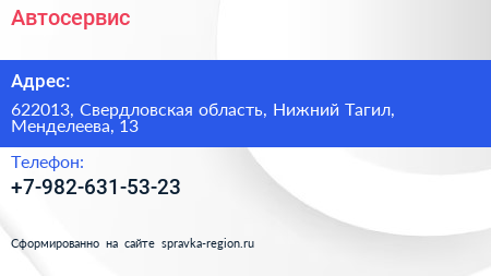 Автосервис по адресу 622013, Свердловская область, Нижний Тагил, Менделеева, 13 в дальнейшем Организация, размещена в следующих категориях: