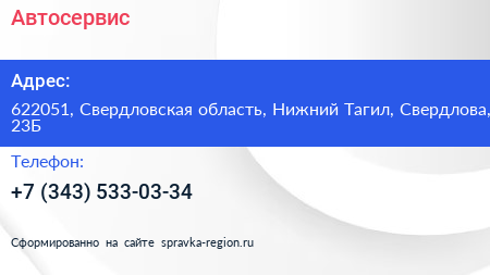 Автосервис по адресу 622051, Свердловская область, Нижний Тагил, Свердлова, 23Б в дальнейшем Организация, размещена в следующих категориях: