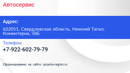 Автосервис по адресу 622051, Свердловская область, Нижний Тагил, Коминтерна, 58Б в дальнейшем Организация, размещена в следующих категориях: