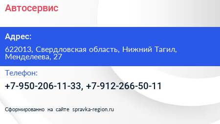 Автосервис по адресу 622013, Свердловская область, Нижний Тагил, Менделеева, 27 в дальнейшем Организация, размещена в следующих категориях: