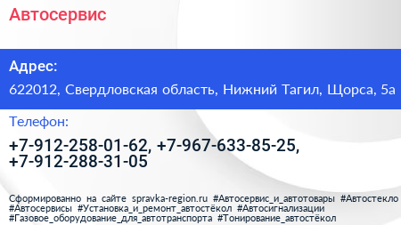 Автосервис по адресу 622012, Свердловская область, Нижний Тагил, Щорса, 5а в дальнейшем Организация, размещена в следующих категориях: