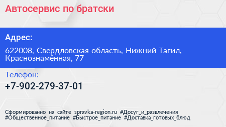 Автосервис-по-братски по адресу 622008, Свердловская область, Нижний Тагил, Краснознамённая, 77 в дальнейшем Организация, размещена в следующих категориях: