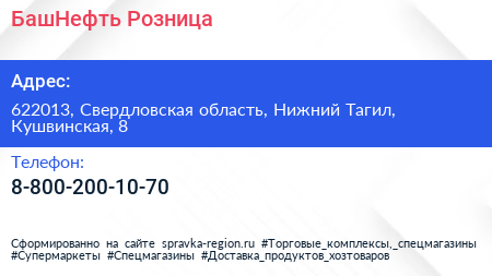 БашНефть-Розница по адресу 622013, Свердловская область, Нижний Тагил, Кушвинская, 8 в дальнейшем Организация, размещена в следующих категориях: