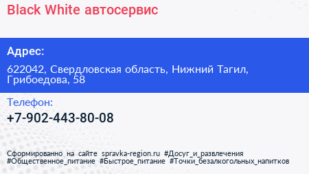 Black & White, автосервис по адресу 622042, Свердловская область, Нижний Тагил, Грибоедова, 58 в дальнейшем Организация, размещена в следующих категориях: