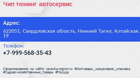 Чип-тюнинг, автосервис по адресу 622051, Свердловская область, Нижний Тагил, Алтайская, 19 в дальнейшем Организация, размещена в следующих категориях: