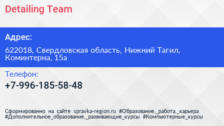 Detailing Team по адресу 622018, Свердловская область, Нижний Тагил, Коминтерна, 15а в дальнейшем Организация, размещена в следующих категориях: