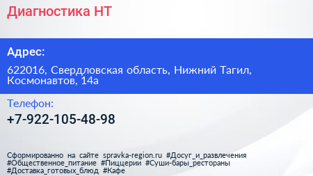 Диагностика-НТ по адресу 622016, Свердловская область, Нижний Тагил, Космонавтов, 14а в дальнейшем Организация, размещена в следующих категориях: