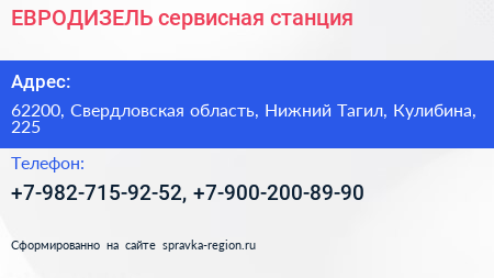 ЕВРОДИЗЕЛЬ, сервисная станция по адресу 62200, Свердловская область, Нижний Тагил, Кулибина, 225 в дальнейшем Организация, размещена в следующих категориях:
