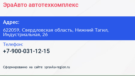 ЭраАвто, автотехкомплекс по адресу 622059, Свердловская область, Нижний Тагил, Индустриальная, 26 в дальнейшем Организация, размещена в следующих категориях: