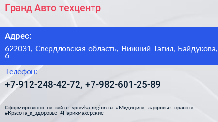 Гранд Авто, техцентр по адресу 622031, Свердловская область, Нижний Тагил, Байдукова, 6 в дальнейшем Организация, размещена в следующих категориях: