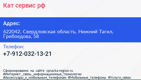 Кат-сервис.рф по адресу 622042, Свердловская область, Нижний Тагил, Грибоедова, 58 в дальнейшем Организация, размещена в следующих категориях: