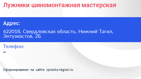 Лужники, шиномонтажная мастерская по адресу 622018, Свердловская область, Нижний Тагил, Энтузиастов, 2Б в дальнейшем Организация, размещена в следующих категориях: