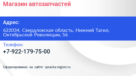 Магазин автозапчастей по адресу 622034, Свердловская область, Нижний Тагил, Октябрьской Революции, 56 в дальнейшем Организация, размещена в следующих категориях: