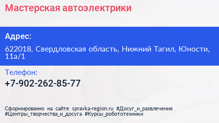 Мастерская автоэлектрики по адресу 622018, Свердловская область, Нижний Тагил, Юности, 11а/1 в дальнейшем Организация, размещена в следующих категориях: