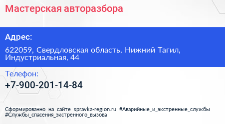 Мастерская авторазбора по адресу 622059, Свердловская область, Нижний Тагил, Индустриальная, 44 в дальнейшем Организация, размещена в следующих категориях: