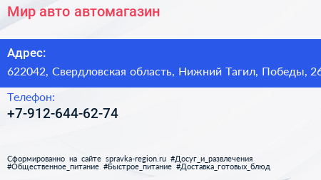 Мир авто, автомагазин по адресу 622042, Свердловская область, Нижний Тагил, Победы, 26 в дальнейшем Организация, размещена в следующих категориях: