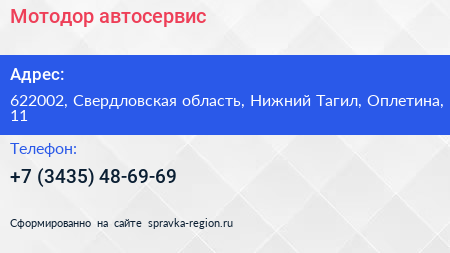 Мотодор, автосервис по адресу 622002, Свердловская область, Нижний Тагил, Оплетина, 11 в дальнейшем Организация, размещена в следующих категориях: