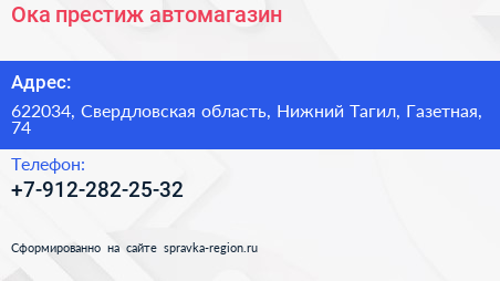 Ока-престиж, автомагазин по адресу 622034, Свердловская область, Нижний Тагил, Газетная, 74 в дальнейшем Организация, размещена в следующих категориях: