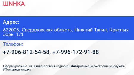 ШNНКА по адресу 622005, Свердловская область, Нижний Тагил, Красных Зорь, 1/1 в дальнейшем Организация, размещена в следующих категориях: