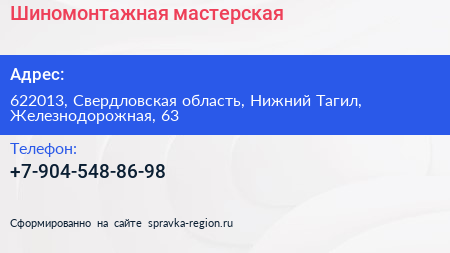 Шиномонтажная мастерская по адресу 622013, Свердловская область, Нижний Тагил, Железнодорожная, 63 в дальнейшем Организация, размещена в следующих категориях: