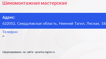 Шиномонтажная мастерская по адресу 622052, Свердловская область, Нижний Тагил, Лесная, 18а в дальнейшем Организация, размещена в следующих категориях: