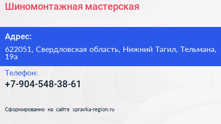 Шиномонтажная мастерская по адресу 622051, Свердловская область, Нижний Тагил, Тельмана, 19а в дальнейшем Организация, размещена в следующих категориях: