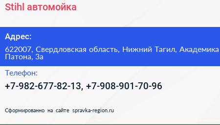 Stihl, автомойка по адресу 622007, Свердловская область, Нижний Тагил, Академика Патона, 3а в дальнейшем Организация, размещена в следующих категориях: