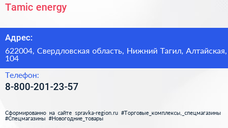 Tamic energy по адресу 622004, Свердловская область, Нижний Тагил, Алтайская, 104 в дальнейшем Организация, размещена в следующих категориях: