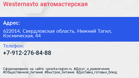 Westernavto, автомастерская по адресу 622014, Свердловская область, Нижний Тагил, Космическая, 44 в дальнейшем Организация, размещена в следующих категориях: