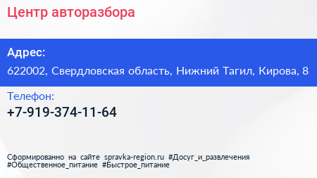 Центр авторазбора по адресу 622002, Свердловская область, Нижний Тагил, Кирова, 8 в дальнейшем Организация, размещена в следующих категориях: