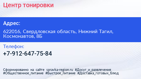 Центр тонировки по адресу 622016, Свердловская область, Нижний Тагил, Космонавтов, 8Б в дальнейшем Организация, размещена в следующих категориях: