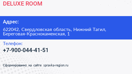 DELUXE ROOM по адресу 622042, Свердловская область, Нижний Тагил, Береговая-Краснокаменская, 1 в дальнейшем Организация, размещена в следующих категориях: