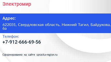 Электромир по адресу 622031, Свердловская область, Нижний Тагил, Байдукова, 6а в дальнейшем Организация, размещена в следующих категориях: