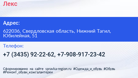 Лекс по адресу 622036, Свердловская область, Нижний Тагил, Юбилейная, 51 в дальнейшем Организация, размещена в следующих категориях:
